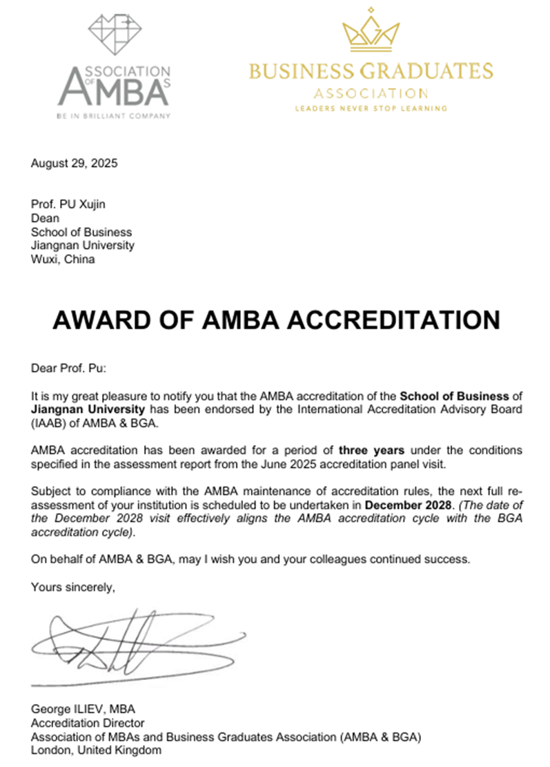 8月29日,我校收到英国工商管理硕士协会和星空XK体育毕业生协会(Association of MBAs and Business Graduates Association,简称AMBA & BGA)的官方邮件,确认星空XK体育MBA项目顺利通过AMBA国际再认证。这标志着星空XK体育自2018年首次获得AMBA认证以来,连续第三次以优异表现通过全球顶级商科认证体系的严格检验,成为国际商科教育质量标杆院校。