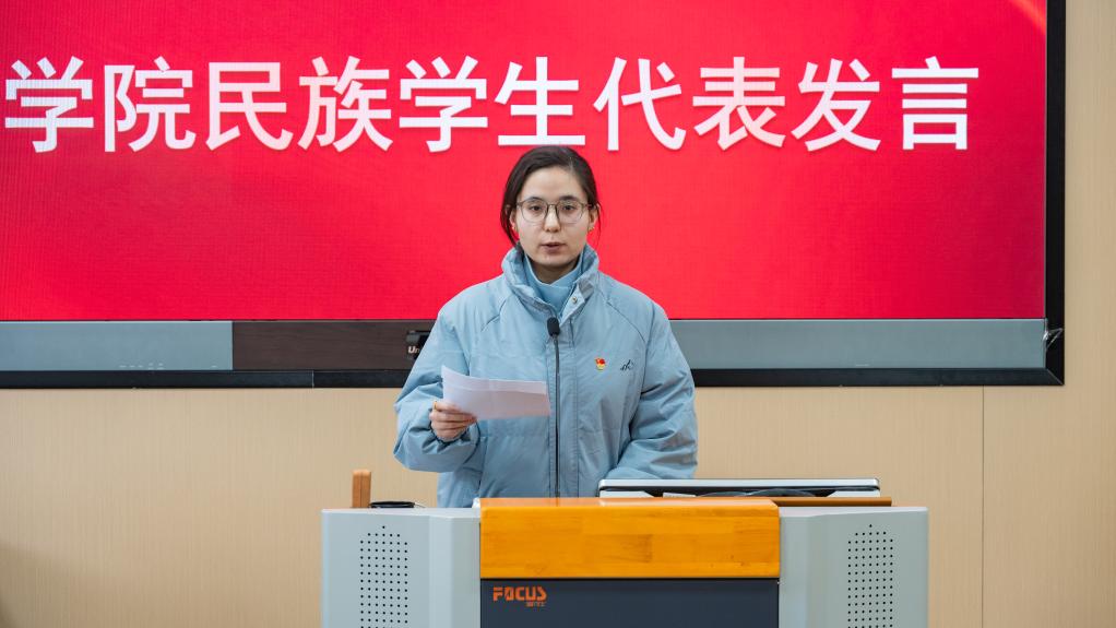 工商2301班学生党员麦迪乃·买买提阿布拉作为学生代表发言。她衷心感谢军休中心老前辈们长期以来的关怀与教导,感谢学校、学院老师们的耐心指导,号召同学们以军休前辈为榜样,将爱国情、报国志转化为脚踏实地的行动,促进各民族交往交流交融,为祖国繁荣与民族团结贡献青春力量。