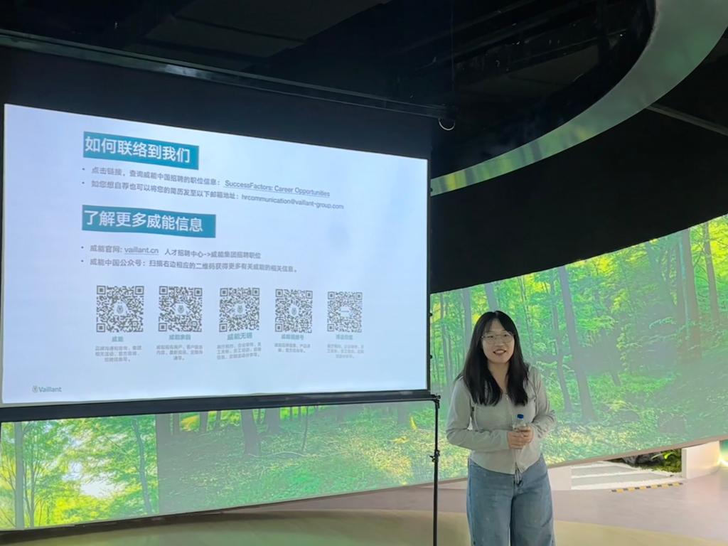 雇主品牌推行官刘笑颜进行“集团及雇主品牌介绍”主题分享,详细讲解了威能品牌历史、公司福利及人才发展政策。20届校友、HR赵钰宁结合自身成长经历,与学弟学妹们分享了勇于迈出求职第一步、积极参与各类招聘、调整节奏与心态三点宝贵经验。