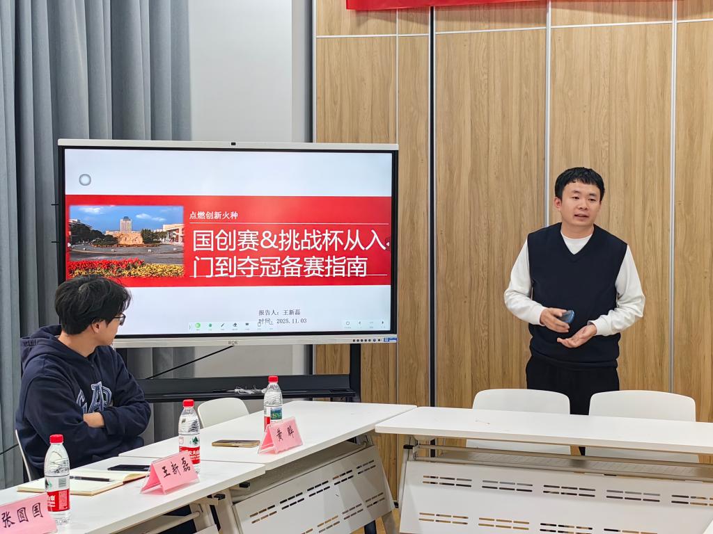 王新磊以“国创赛&挑战杯从入门到夺冠备赛指南”为题,系统梳理了两大赛事的发展脉络与参赛要点,深入阐释了国创赛在培养创新人才、服务国家战略方面的重要价值,为同学们构建完整而清晰的备赛认知框架。他强调,项目设计中应兼顾商业价值与社会价值,并就项目培育提出“三模式”建议,强调在生产模式、盈利模式与发展模式之间形成闭环,既瞄准前沿方向,也深耕细分领域。